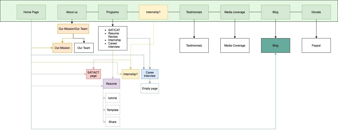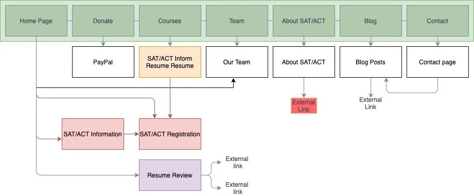 The website has some unnecessary links and extra pages that make the website more confusing and harder to navigate. Users need to go through a lot of steps to get the information. I decided to reduce the number of pages by moving some information to the front, combining some information as well as deleting other information: