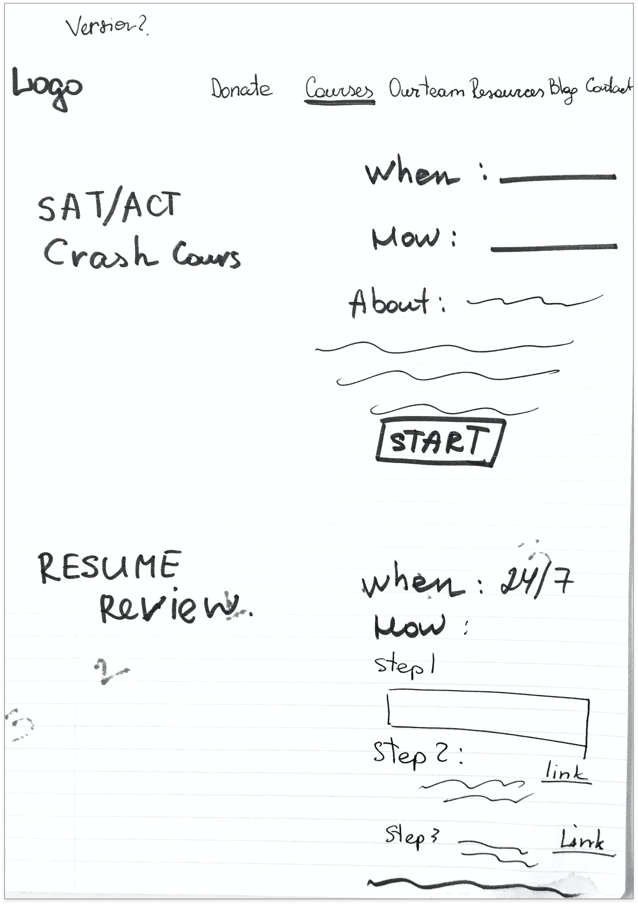 On the course page, I divided the information about courses out into several blocks because after usability testing, I understood that users were not ready to read a lot of tiny text. For “SAT/ACT Crash Course” there are no separate big steps, so I highlighted the schedules and provided small instructions. On the "Resume review" part, I decided to provide instructions as well, but because this course requires more actions from users, “Steps” are the best decision for this.